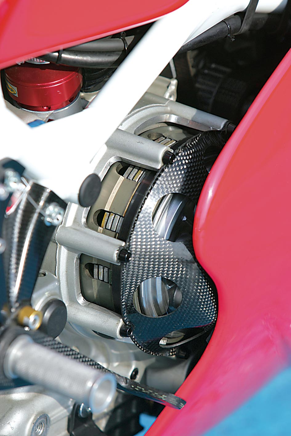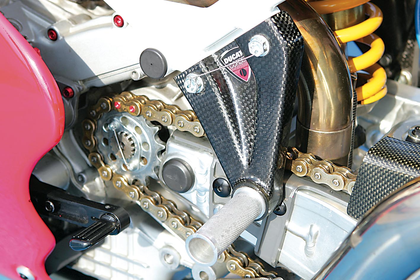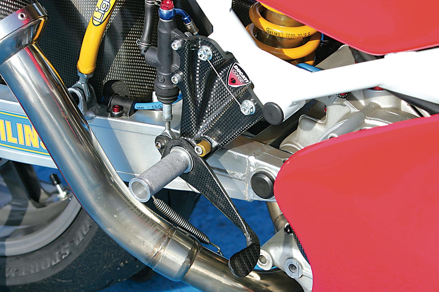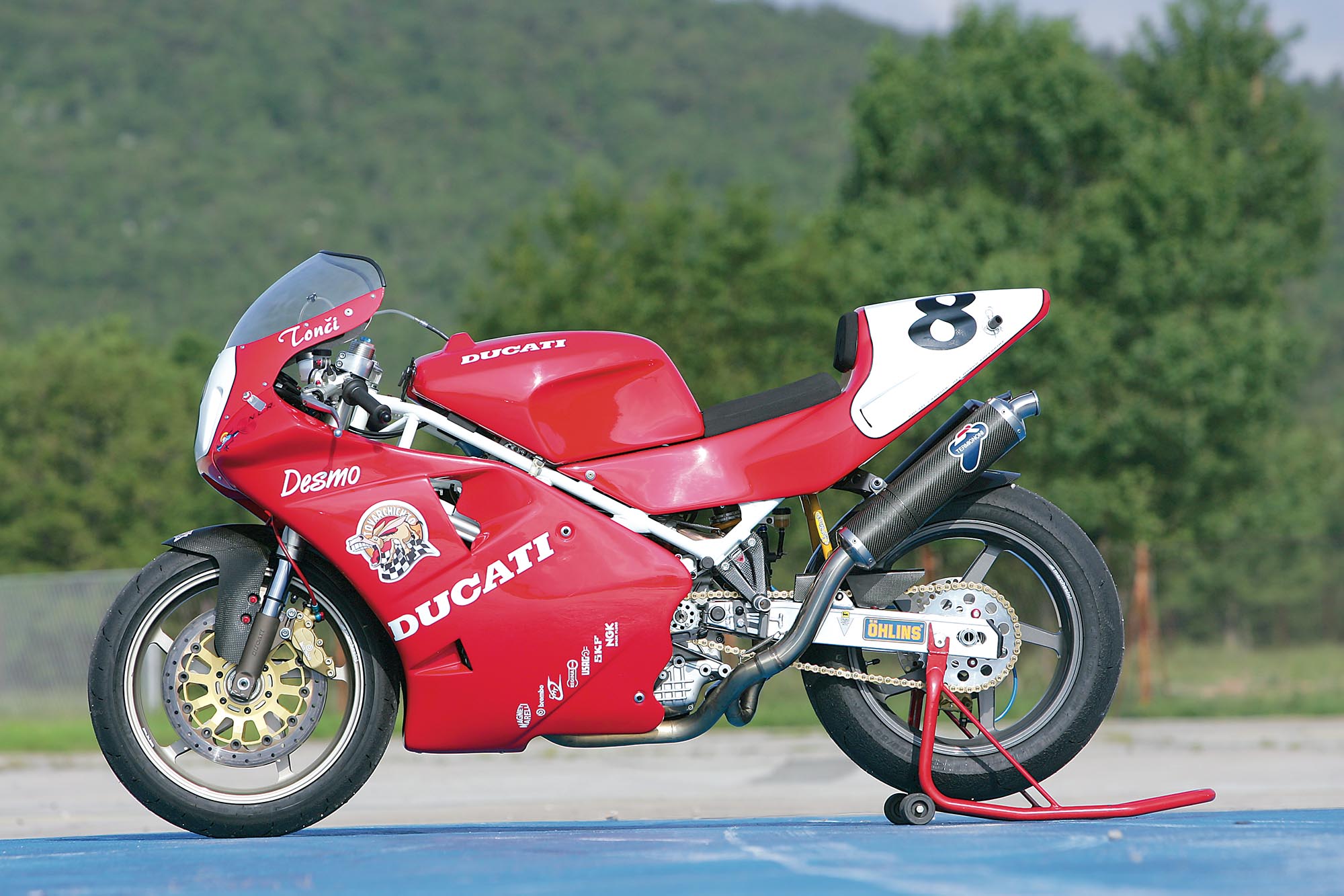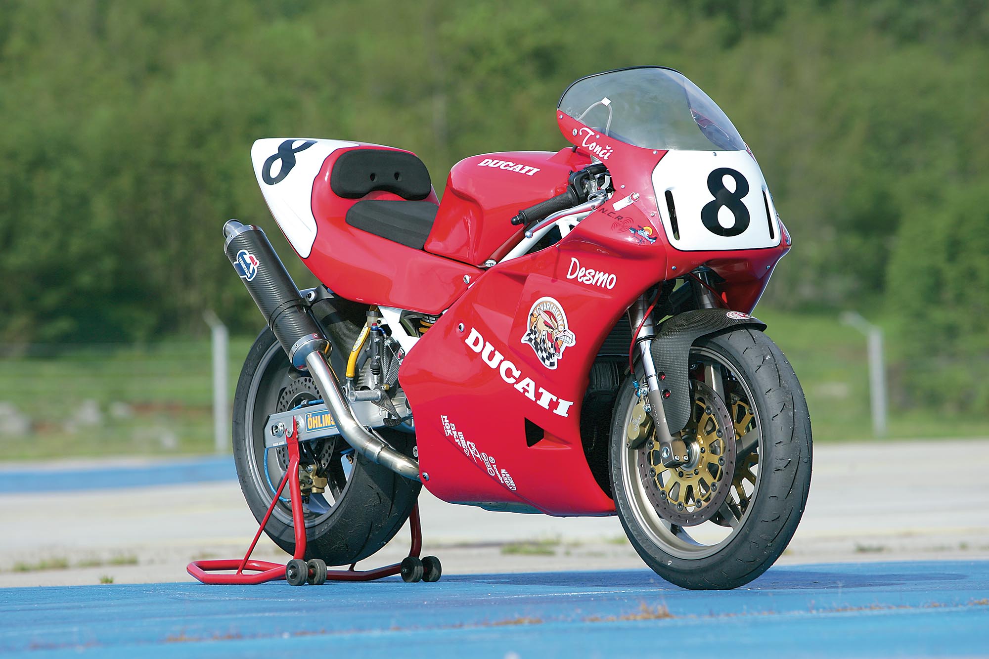 Osnova za nadogradnju je tu, zahvaljujući bivšem vlasniku ima ugrađenih interesantnih komponenti - od Akrapovičevog ispušnog sustava, Öhlins stražnjeg amortizera i Keihin Racing rasplinjača do oku nevidljivih komponenti unutar agregata kao što su Carillo klipnjače od titana i Cosworth klipovi te olakšani zamašnjak. Ostalo je i nešto dijelova brižljivo sakupljanih godinama, karbonski oslonci za noge koje je donirao Kec još u vrijeme kada je na utrkama vozio 888, zatim Brembo racing diskovi promjera 320 mm koji su svojevremeno bili rezerve Željku Štimcu dok je pobjeđivao na Ducatiju 916 Racing, oplata stražnjeg kraja od ugljičnih vlakana, prednji Marchesini magnezijski kotač, spremnik goriva od 888 (koji se naknadno pokazao preteškim) i brdo sitnica koje nećemo pojedinačno nabrajati. Sve u svemu, bio je to projekat u skladu s ovim kriznim vremenima: bez predubokog zalaženja u džep, kako to već biva sa svime što ima “Racing” u svom nazivu.