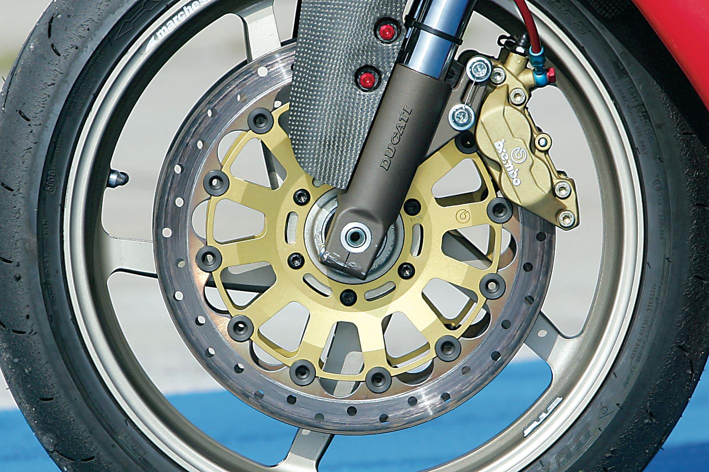 Prednji ovjes na “Tovarčićku” je preuzet od modela Superlight. Naravno da bi tu dobro došle Öhlinsove FG-43 cijevi, koje bi upotpunile sliku s postojećim stražnjim amortizerom, no ipak se radi o recesijskoj ”pili”, pa su i te Superlightove vilice čisto dobre. Zanimljivo je da te vilice s početka 90-tih imaju u jednoj cijevi regulaciju kompresije, dok je u drugoj povrat. Takvo rješenje možete vidjeti sve češće na modernim motociklima, doduše, možda ne na supersportašima - koji su malo zahtjevniji u stupnjevanju ovjesa - nego više kod sport-touring modela.